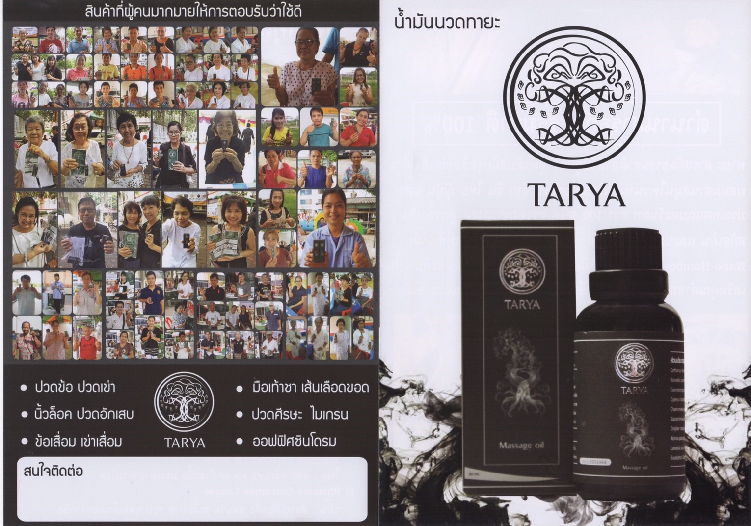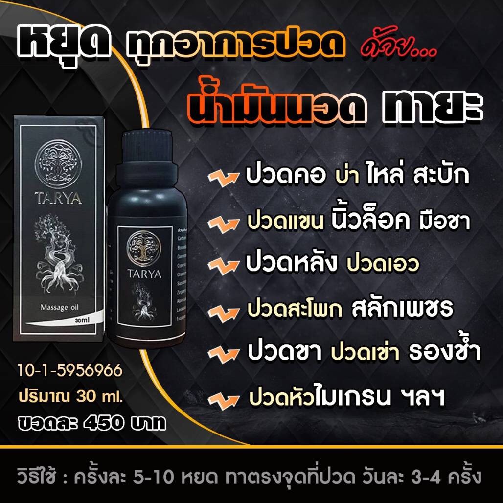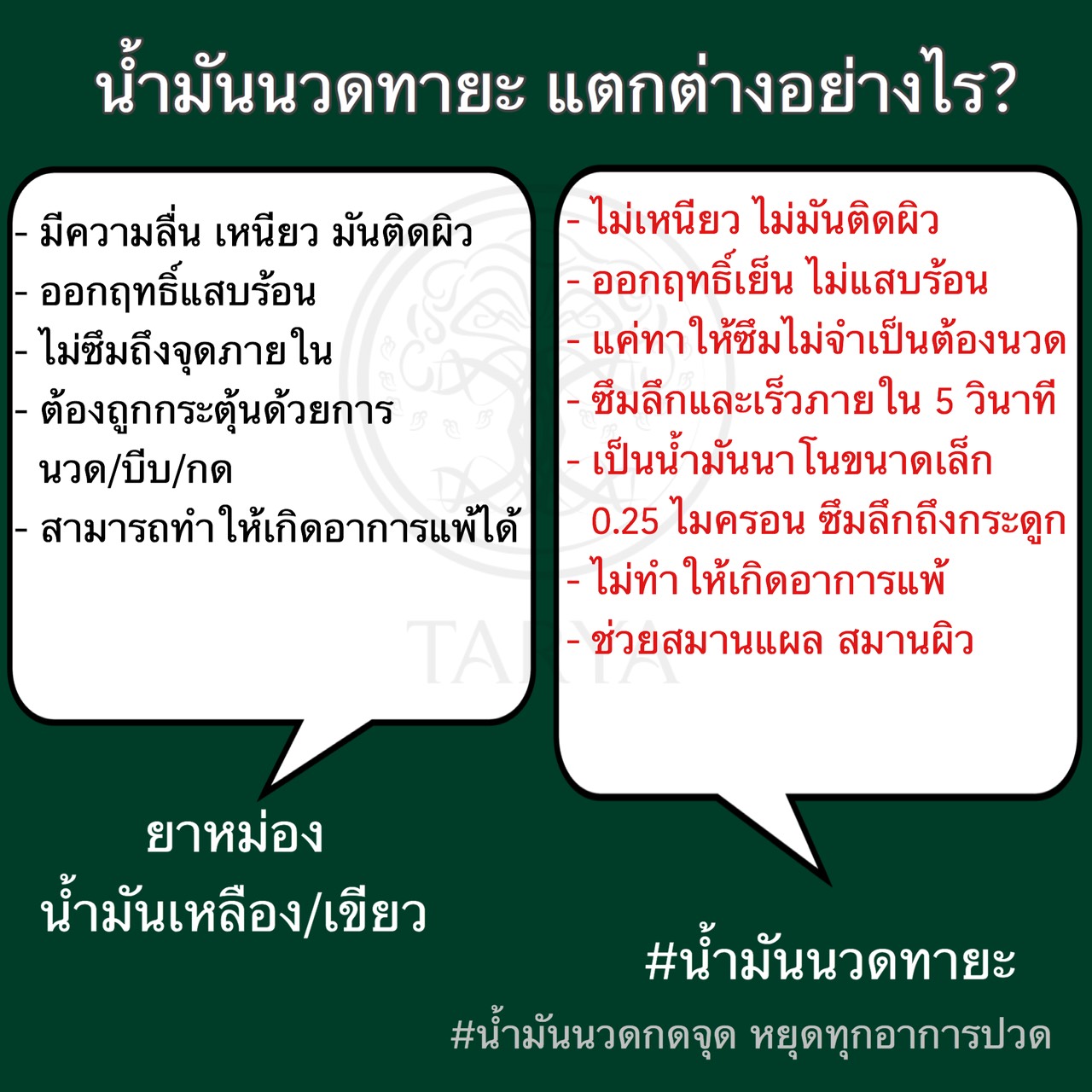 วิธีใช้ : ทาในบริเวณที่ปวดหรือมีอาการโดยไม่ต้องนวด เพียงแค่ทาให้ชุ่มและวนจนตัวยาซึมหมด หรือหากต้องการให้เห็นผลเร็ว อาจใช้ร่วมกับการประคบร้อน โดยการใช้ผ้าชุบน้ำอุ่นประคบประมาณ 5-10 นาที ก่อนทาน้ำมันนวดทายะ